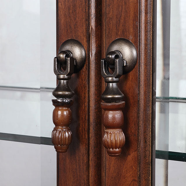 Luxurious and grandiose traditional style is distinguished by this dining set. Turned legs showcase the expert construction as it gracefully details the expandable leaf dining table. Lie back on foam cushioned leatherette chairs and rest comfortably with soft curving armrests. The glass encased curio accents your living room beautifully while its tempered glass shelves and soft lighting showcase your decor, store dinnerware and organize other essentials with ease.