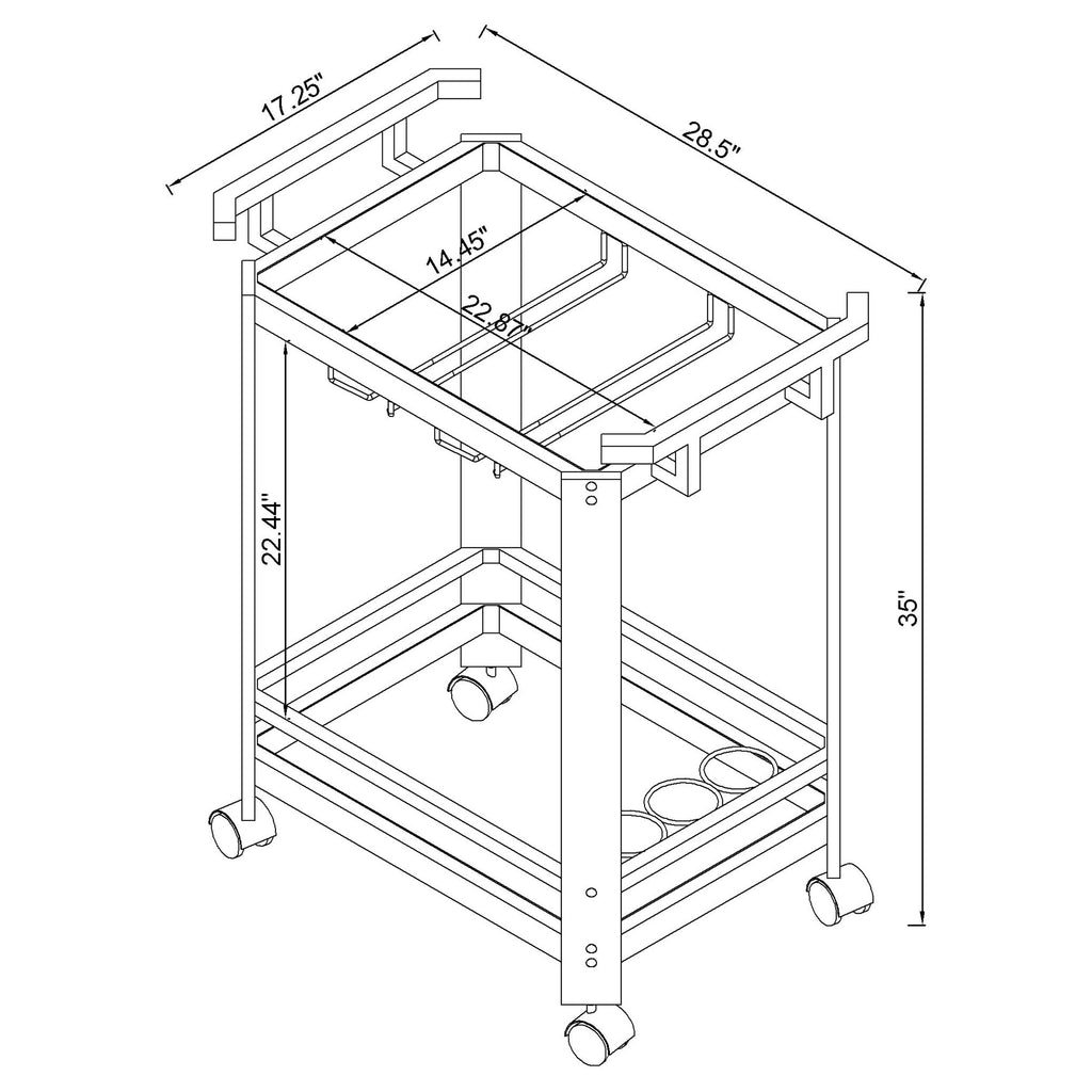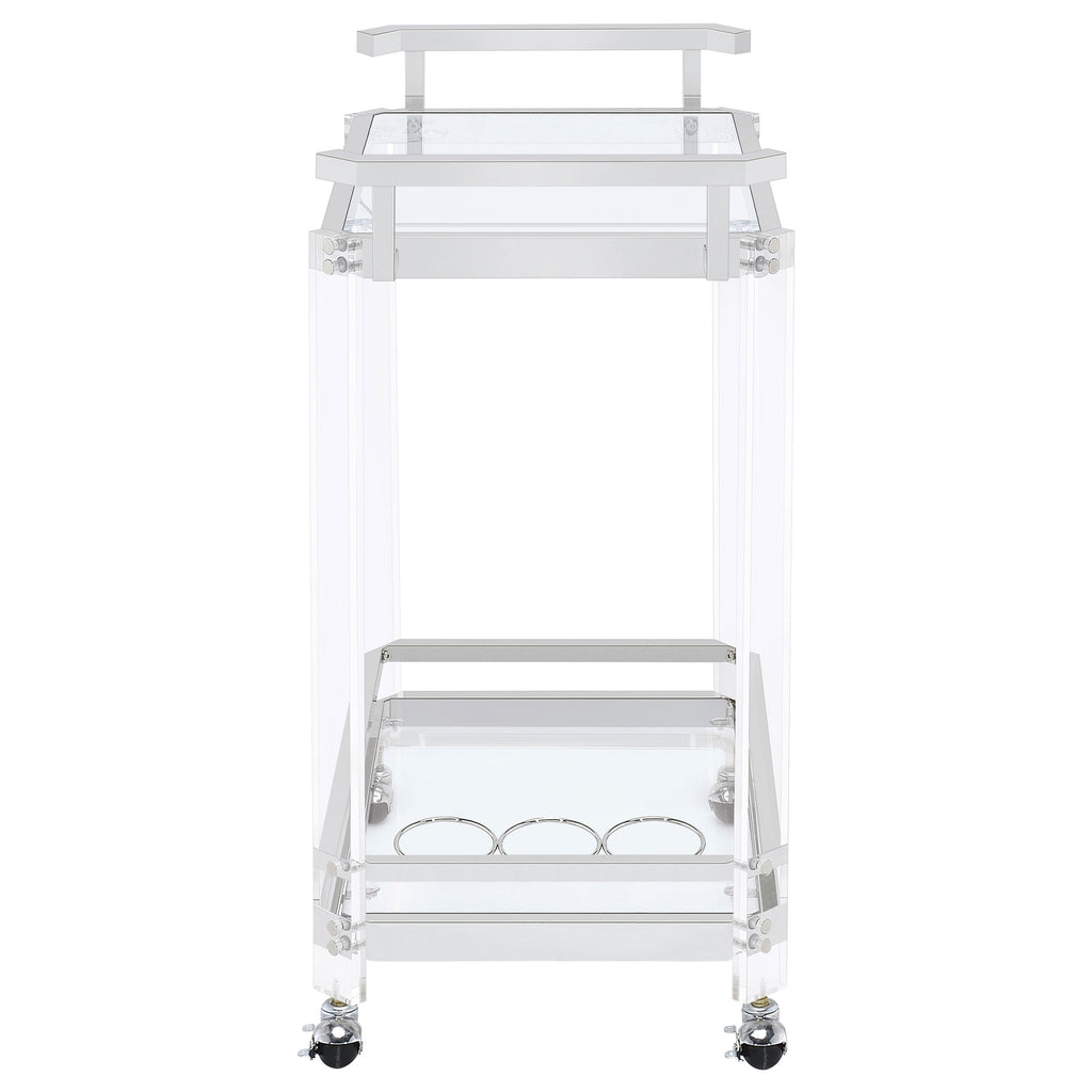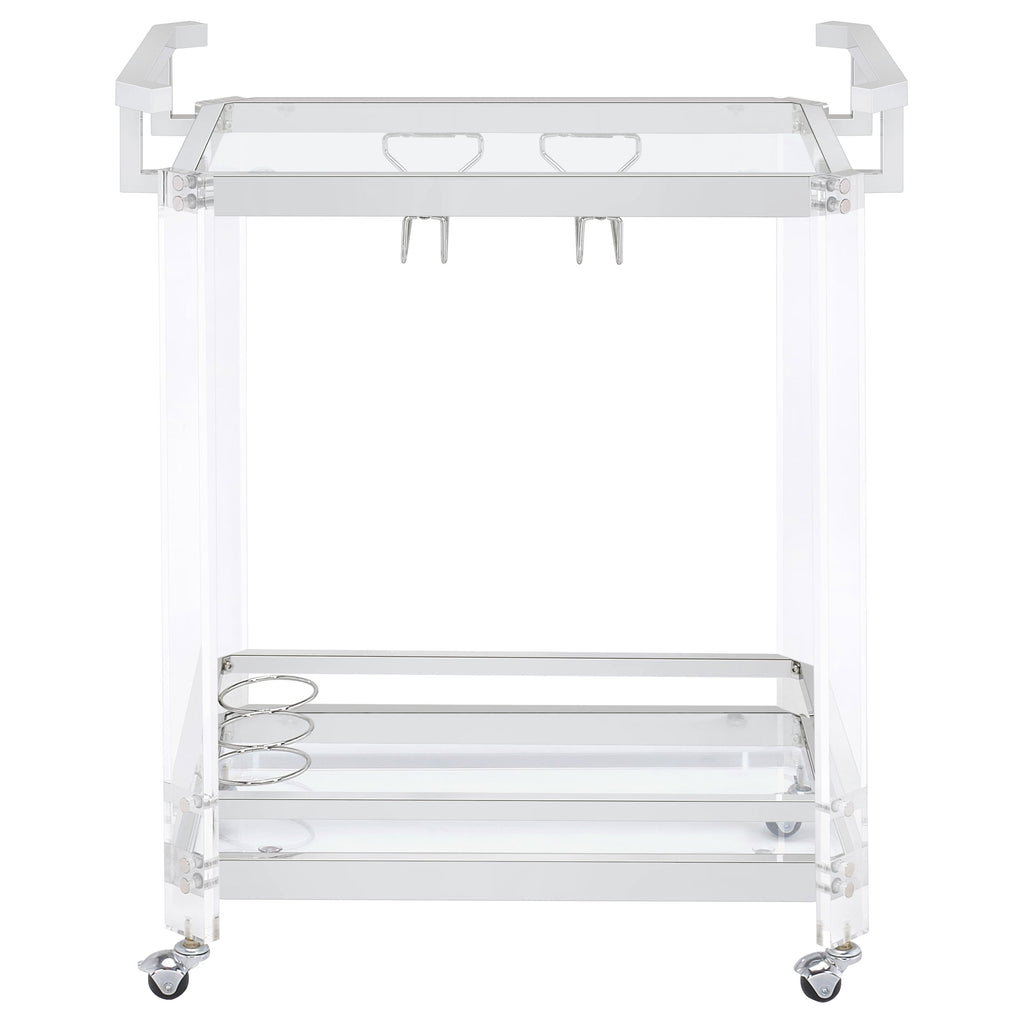 A serving cart is a delightful accoutrement for any home bar or indoor patio. This serving cart takes it to another level with an acrylic and metal frame finished in chrome. It features clear tempered glass shelves that's simple yet modern. Bottom shelf features wine bottle holders while top shelf features a stemware rack underneath. With convenient wheels, take this serving cart wherever drinks are in demand. Key Features: • Clear acrylic posts add a touch of modern to this serving cart • Chrome finish enhances forward looking design • Two (2) tiers of clear tempered glass shelving accentuates minimalist design • Stemware rack, three (3) bottle wine rack, and casters are among the functional features • Steel, acrylic, and glass construction