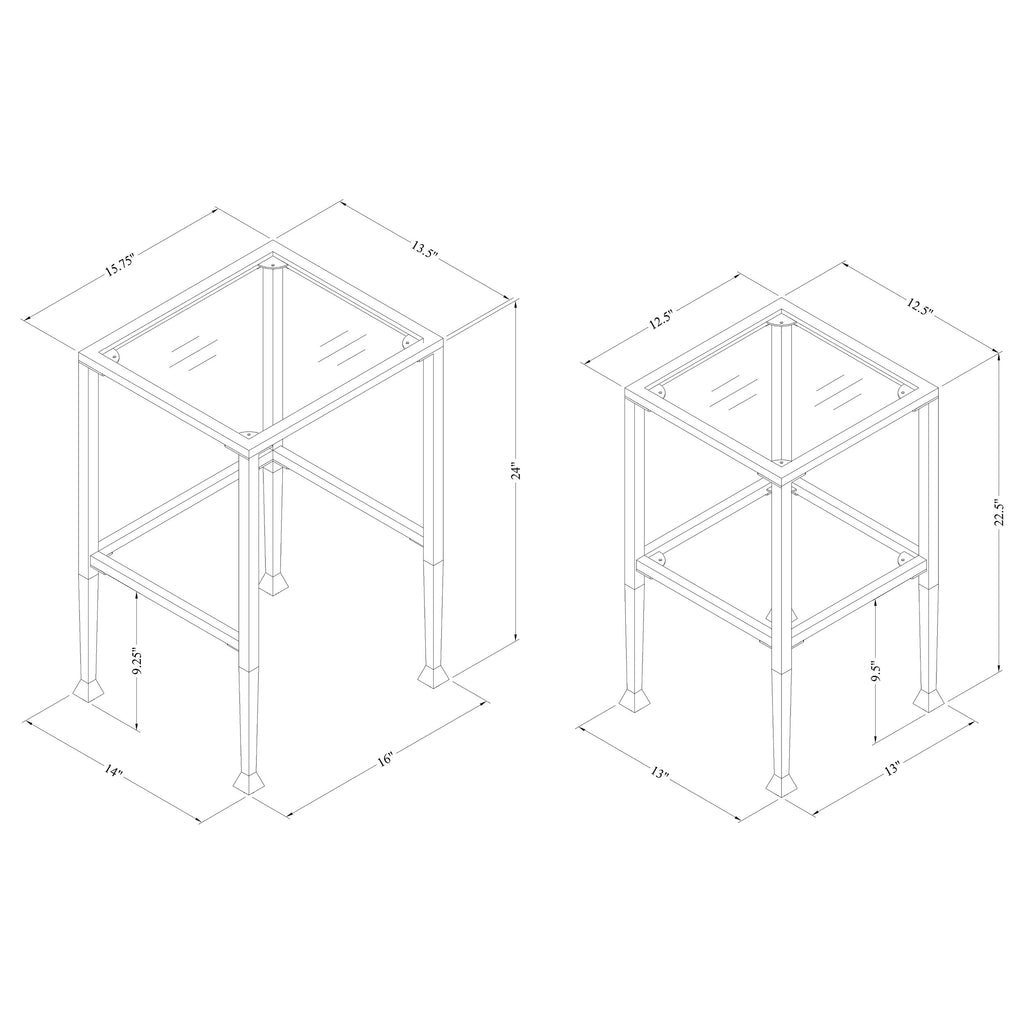This two-piece nesting table set features sleek, modern design with clear tempered glass tops and shelves. The black powder-coated metal frame ensures durability and stability while enhancing the contemporary look of your living space. Perfect for compact areas, these tables can be conveniently nested when not in use and easily separated for versatile placement. Whether used as accent tables or side tables, their clean lines and minimalist design make them a practical and stylish addition to any home. Key Features: • Two-piece nesting table set with tempered glass tops and shelves for a modern aesthetic • Black powder-coated metal frame offers a sleek, durable finish and ensures lasting support • Clear tempered glass provides a polished, smooth surface while offering an open feel • Versatile design allows for easy nesting and separate use for added flexibility in your space • Sturdy construction with a metal frame and glass surfaces, perfect for everyday use • Simple, clean lines make this table set a stylish and functional addition to any living room