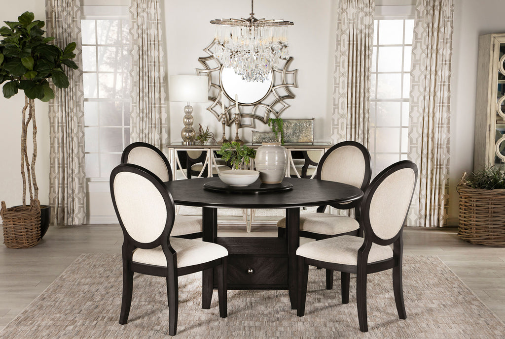 Elegant curves and contrasted finishes collide in this transitional side chair. A lovely addition to a dining space, this stunning chair can be slid up to a table for a comfortable place to sit over a long dinner, inviting you to lean back against its padded oval back and padded seats, each wrapped in a cream linen-like fabric with welt trim details. The timeless design of the Neoclassical oval backrest offers a wood trim that mirrors the rest of the wood frame. Encasing the padded elements is a rich, dark cocoa finish that lends a bold look. Square tapered legs in front and flared legs in back offer a subtle grace that completes this furniture piece. Key Features: • Oval back dining chair in a dark cocoa finish features elegant curves and Neoclassical charm • Cream chenille upholstery highlights the oval backrest and seat with welt-trimmed edges • Square front legs and flared rear legs add structure and grace to the wood frame • Side chair crafted from solid rubberwood, engineered wood, and oak veneer for strength • Foam-cushioned seat and backrest offer plush comfort for daily use or formal gatherings • Refined dining room chair silhouette suits transitional spaces and classic interiors
